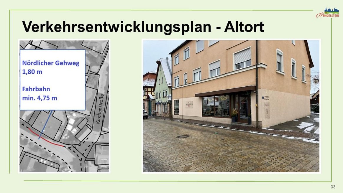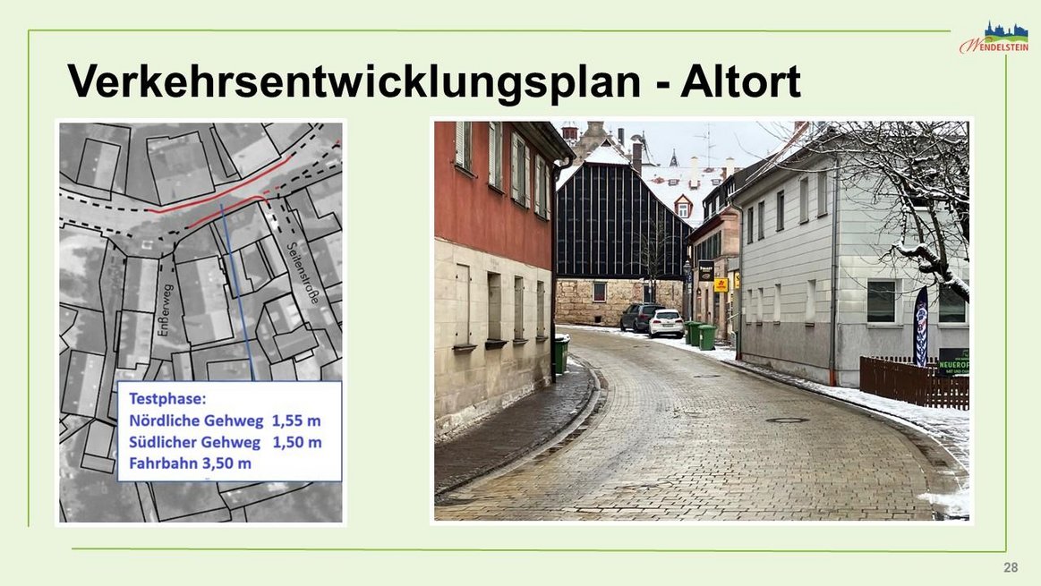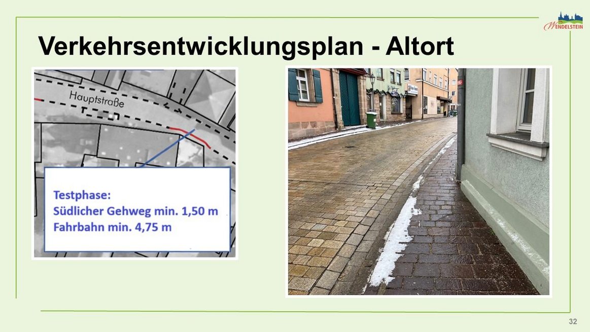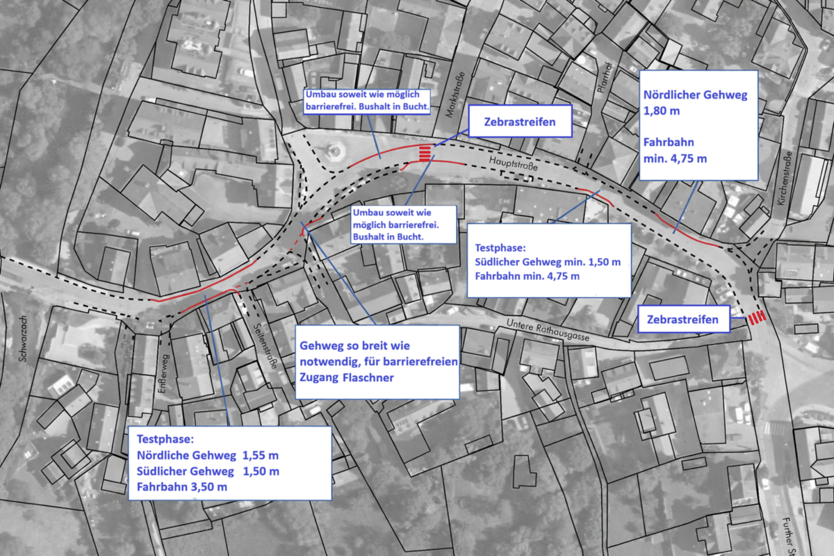Verbreiterung der Gehwege vor den Häusern Hauptstraße 5 bis 7 und Seitenstraße 2 zur Realisierung einer einspurigen Engstelle (Länge etwa 25 m).