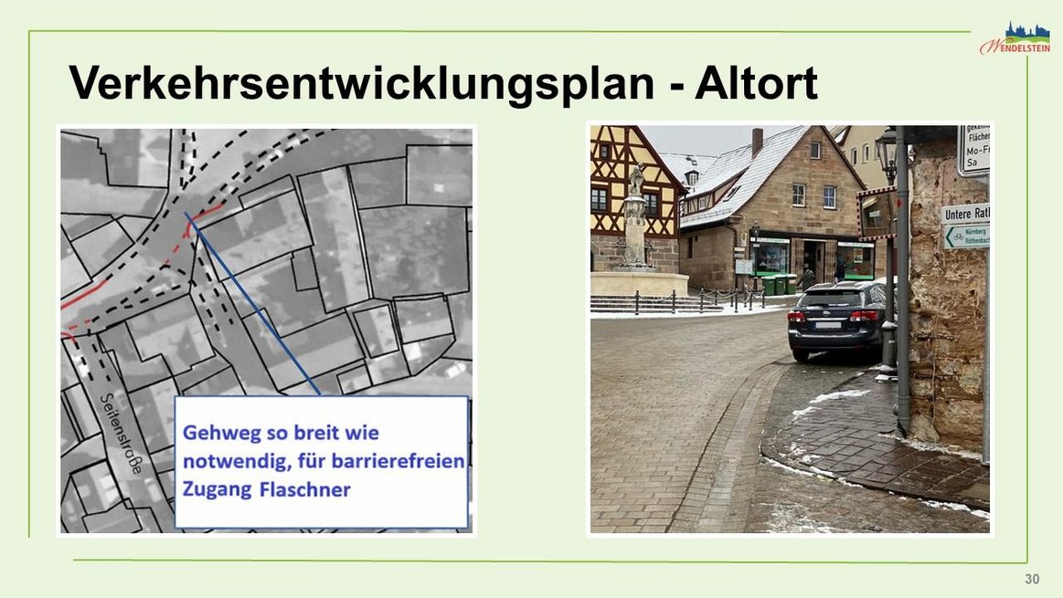 Die Verbreiterung des Gehwegs vor Haus Hauptstraße 12 auf weniger als 2,20 m, unter Berücksichtigung des barrierefreien Zugangs für die geplante Eisdiele im Flaschner.