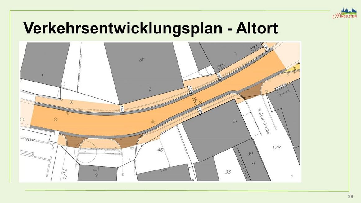 Verbreiterung des Gehwegs vor Haus Hauptstraße 29 zur Realisierung einer kurzen zweispurigen Engstelle (Fahrbahnbreite mindestens 4,75 m für den Begegnungsfall Pkw/Pkw), Gehwegbreite von 1,80m.