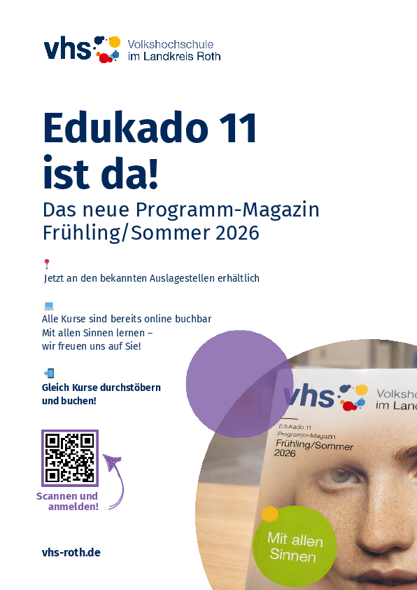 Das vhs-Magazin mit dem gesamten Kursprogramm des Landkreises liegt ab Ende Januar 2026 an den bekannten Orten zur kostenlosen Mitnahme bereit. Sie erhalten es auch in den Rathäusern und gemeindlichen Einrichtungen sowie in den vhs-Außenstellen des Landkreises Roth.
