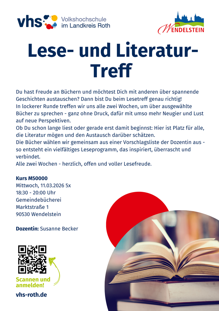 Das vhs-Magazin mit dem gesamten Kursprogramm des Landkreises liegt ab Ende Januar 2026 an den bekannten Orten zur kostenlosen Mitnahme bereit. Sie erhalten es auch in den Rathäusern und gemeindlichen Einrichtungen sowie in den vhs-Außenstellen des Landkreises Roth.